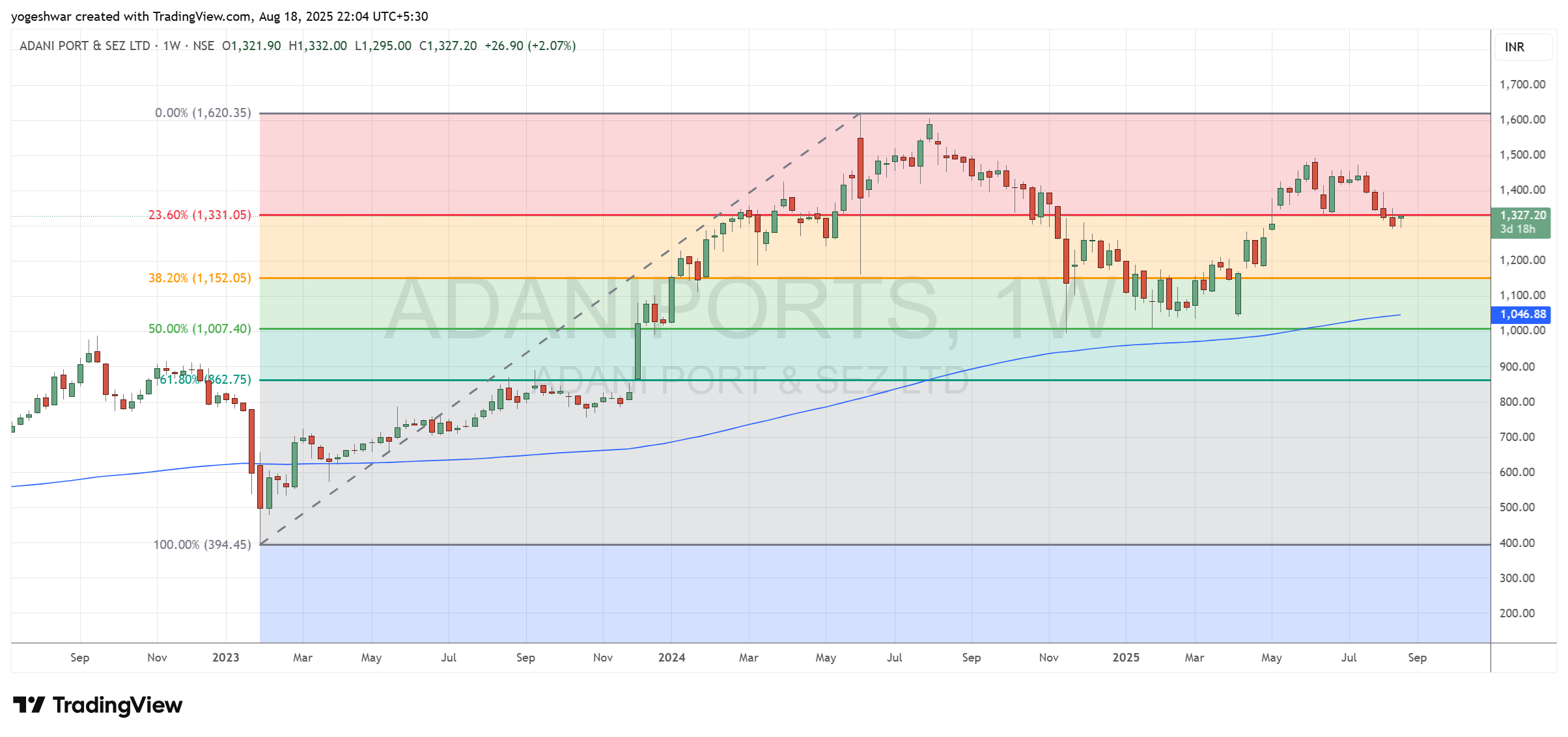 Adani Ports is riding strong bullish momentum after rebounding from a key retracement level, now approaching stiff resistance near a distribution zone.