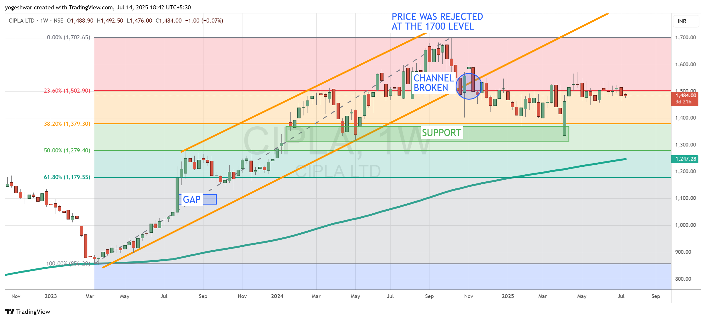 Cipla is currently stuck in a sideways zone, consolidating between key retracement levels while setting up for a potential move higher.