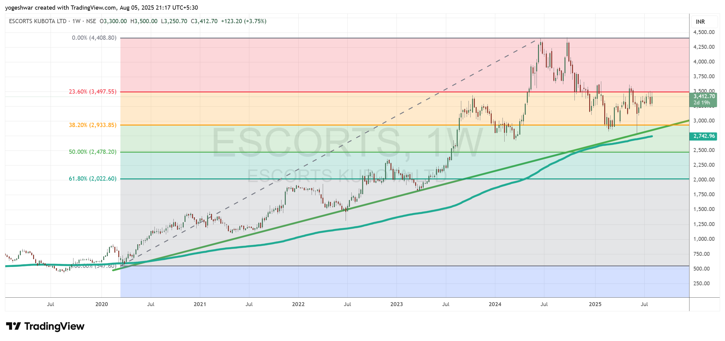 - The stock consistently receives strong support at its long-term uptrend line