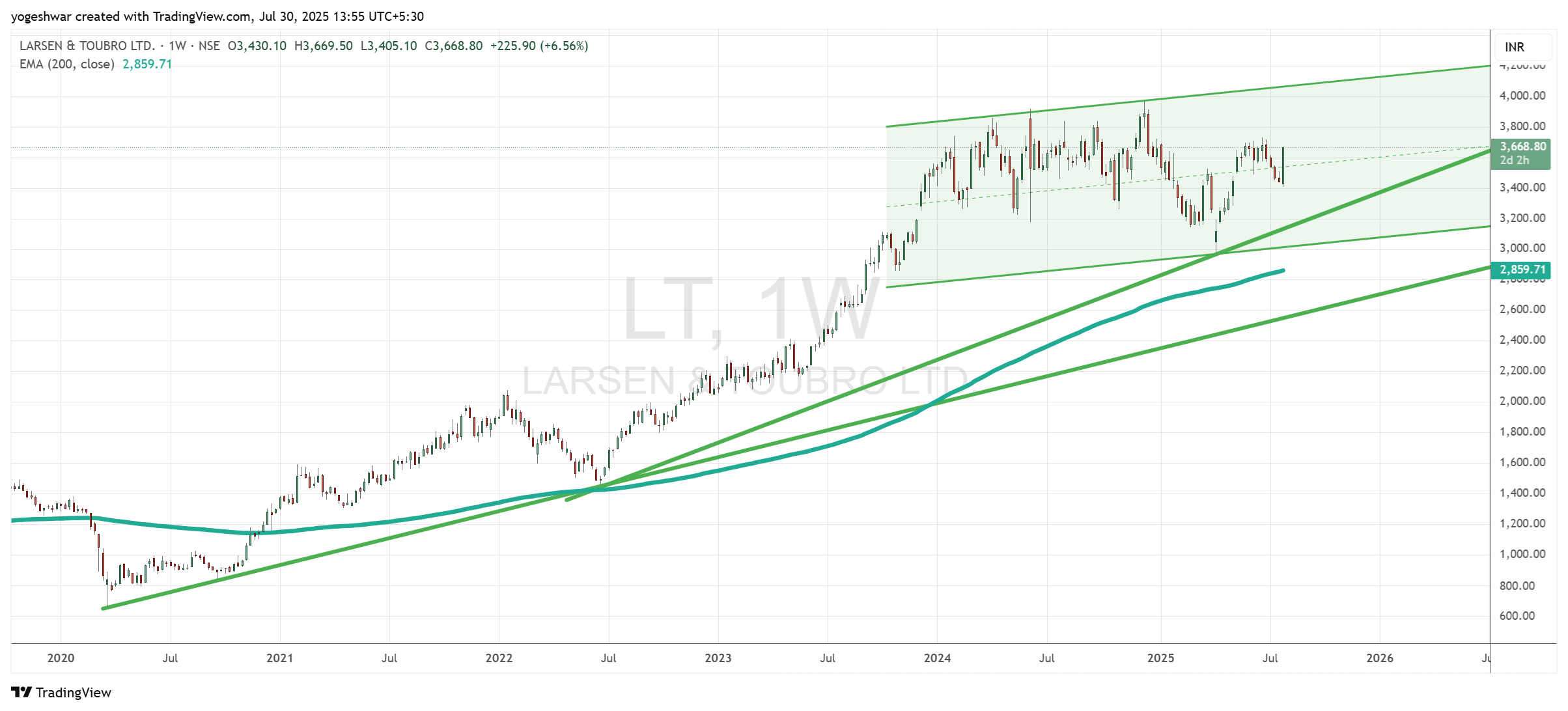 LT surged nearly 6% after posting impressive Q1 FY26 earnings, reinforcing its position within a mildly bullish up-trending channel.