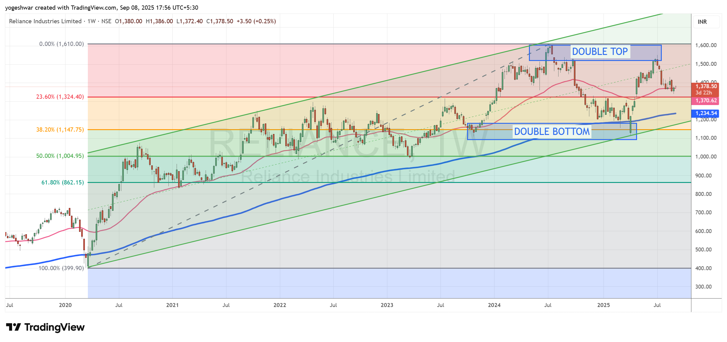 Reliance is trading within a wide, mildly bullish uptrend, offering clear accumulation opportunities as it nears key moving average levels.